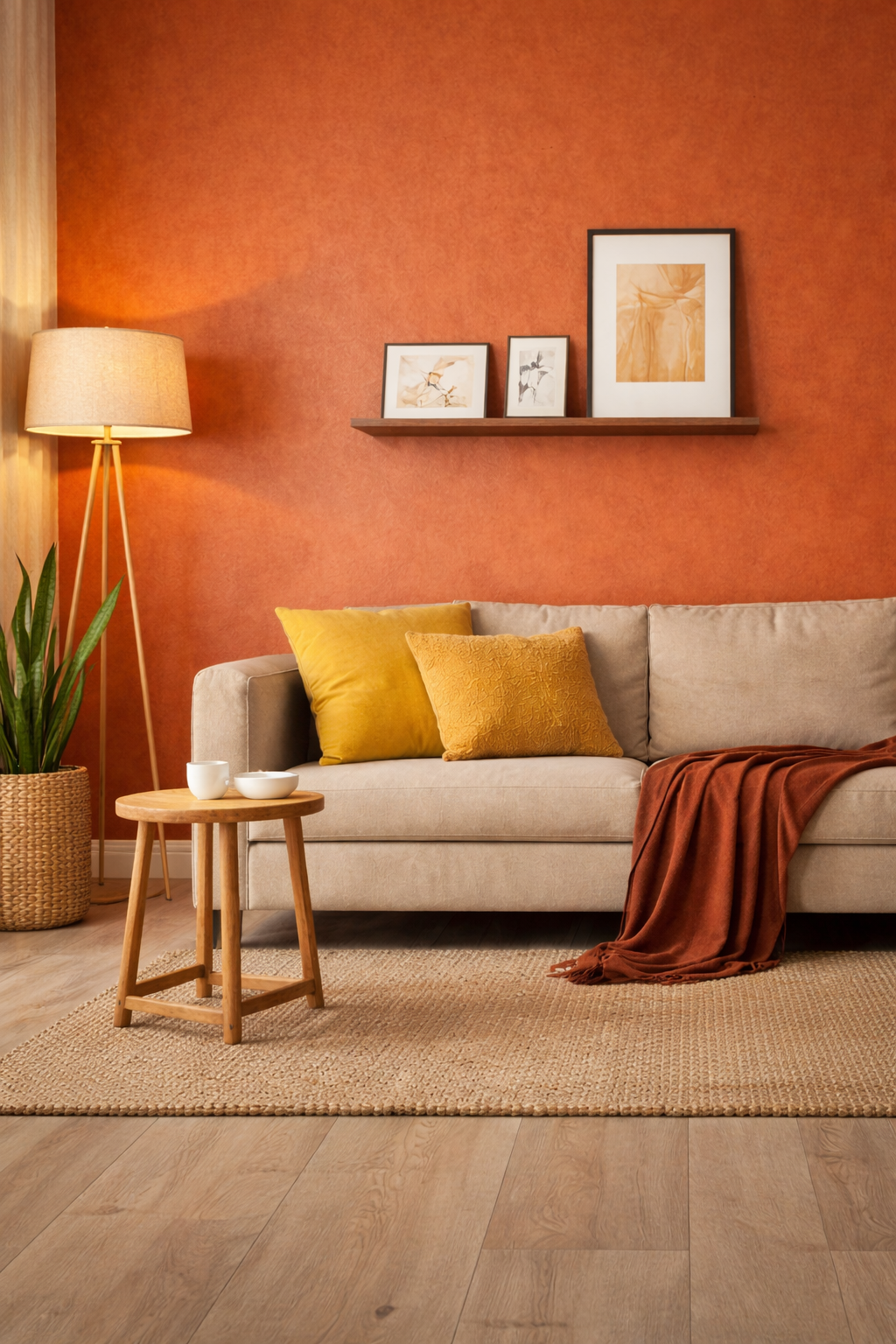 Salón: tonos cálidos y acogedores (beige, terracota).